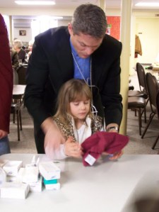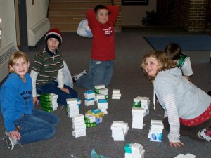 Even after we counted, donations continued to be put outside the office door and dropped off at Grace. We set up fellowship hall for optimum assembly line production and prepared for the chaos of sunday school kids, confirmands, and coffee drinkers in the midst of health kit packing frenzy. It pretty much was pure chaos with a small bit of organization mixed in but the result was utterly impressive. We have boxes and boxes of health kits, wrapped together with rubber bands, ready to be dedicated and taken to the St.Paul warehouse.