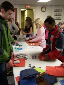 Upon my return a week later, I was completely and wonderfully overwhelmed with all of the donations that had come in. We decided we should probably have a count or at least a rough estimate of what we had and what we still needed. Perfect job for my third graders – they were excellent counters. Look at those bars of soap in piles of ten!
