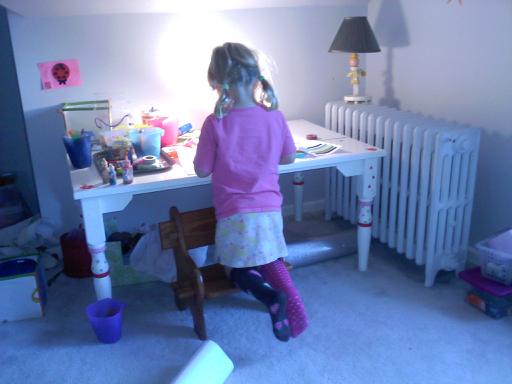 M. loves to craft things. Most specifically? Crafting anything with tape. I laughed with absolute joy when she proclaimed, kneeling at her craft table, “I love tape.” *scotch tape in hand, ripping another long piece with which to attach a feather or button* “I love tape,” she said again.