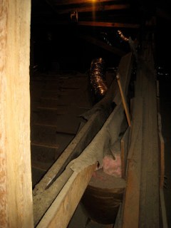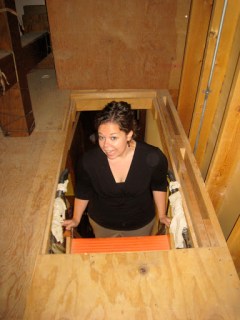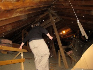 Remember back with me to my last day at Grace in Dawson. Nearly a month has passed. I still miss it, no doubt. (Stay tuned for another blog post about a short return trip to gnometown.) On that last day, I got the much-promised tour of the church attic by the custodian I call Keith (or Batman), the custodian who calls me Sunshine. We had talked about touring the attic many times; I promised Keith I wasn’t too chicken to meet the bats (while, secretly, I really would shriek if I found one swooping in my general direction). With no further days to do it, up the ladders I went in my Nine West heels, along with other interested coworkers and coworker’s children. Sharon documented the occasion for me. Ready?
