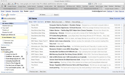 20 SepI had this discussion with my brother when I was home last weekend – We love Google. Taking over the world maybe they are but I’m in love with many of their applications. Gmail. Google chat. This blog is on a Google program. (Thank you, Google.) Picasa for photo sharing. Google Docs for surveys and sharing of papers. (… which I never did give you a tutorial on, Sharon. Let me know what your needs are for it and I can email directions!) And finally, the greatest of my loves: Google Reader.