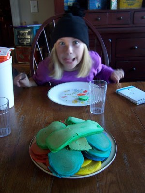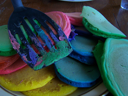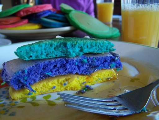 They tasted no different than boring pancakes. Perhaps, they even tasted a bit better because of how awesome they are in rainbow colors. Oh, the possibilities of food coloring gels.
