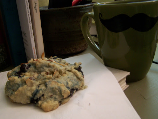 I slightly followed/slightly altered this scone recipe this morning, adding blueberries, lemon zest and toasted almonds with almond milk instead of cream. Next to coffee in my mustache mug (Thanks, Cassie!) and this Monday is okay by me.