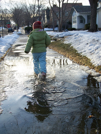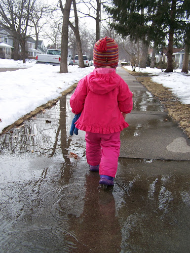 Puddle jumping. M. and I used to go puddle jumping. These photos are from two different years, the years when babysitting for her consisted of walking up and down the sidewalk, up and down the sidewalk. Oh for cute.