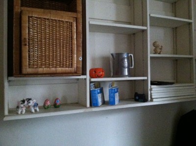 | Pretty plates. Silver serving spoons. And baby shoes? Who organizes this way?! |