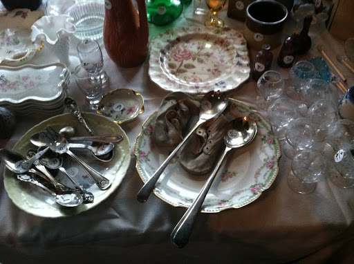 | Pretty plates. Silver serving spoons. And baby shoes? Who organizes this way?! |