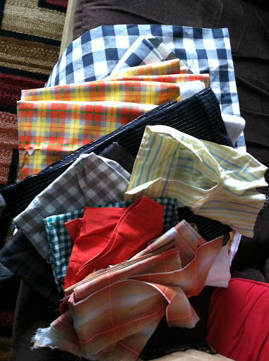 There are easily three yards of the yellow/orange/green plaid home decor weight – fabric that would cost about $9/yard at full cost and the type of fabric that is ideal for making grocery totes. The gray gingham is also home decor weight, and as I unwrapped the taped bundle, I discovered that half of the bundle appears to be a finished table runner. So now I guess I own a gray checked table runner? And a shirt sleeve. Do you see the yellow striped shirt sleeve? It was inside of another bundle of fabric. A tad creepy? I think so. [At least it was just the shirt sleeve and not, like, the arm that was in the sleeve. Dan Brown, get out of my head!]