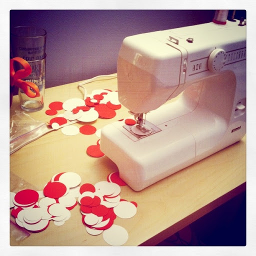 | More red and white on my sewing table. Garland central. [And a few epic dance party glasses for smiles.] |