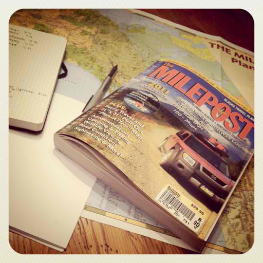 Second, the Milepost. You likely can’t read the header at the top of this hefty guide so please, allow me. “Since 1949, the bible of north country travel.” This will tell me where to find gas, when to watch out for moose, and where I can stop and have a photo op with a t-rex. [Milk River, Alberta, Canada] This hefty book will be my friend and guide for the next couple weeks as I plan my route, my stays, and actually make the drive.