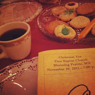 First story. I went to the Baptist church Christmas tea last week with a car of congregation members. The program was lovely and then we had coffee/tea/desserts in the basement. There were super polite – SUPER polite – boys [high school-ish] going table to table, serving the beverages. One boy stopped at our table, asked if anyone wanted water, and when our table declined his offer, he BOWED and began to walk away. Until he came back and said this to me: Excuse me, ma’m, might I say that is a very beautiful ring you’re wearing. *bow* [Awkward?]
