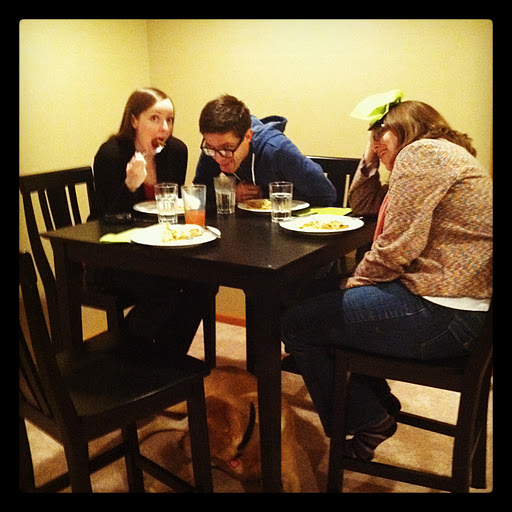 In the evening, Mabel and I welcomed Paige, Lauren, and jD for dinner. Remember that Thai chicken pizza I meant to make last weekend but work got in the way? It was a group effort and even with four people, it took us longer than the thirty Rachael tells us it should. In the end, it was worth every matchstick cucumber and every zested piece of cheese. [Zested because I don’t own a cheese shredder. Now – twenty four hours later – I recall that my food processor can shred cheese. Don’t tell Paige and jD.] It’s a pizza with plum sauce, bean sprouts, scallions, and peanuts and incredibly delicious. A definite to-be-made-again recipe. [Got that, Lynn? Give it a try!]