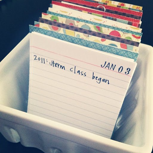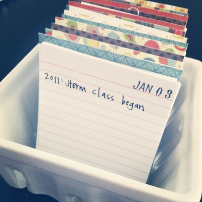 2 JanLast year at this time, I assembled an index card daily calendar journal of sorts. [which I learned how to do here.] I chopped index cards in half, labeled each with a day, and put them in order in a box. The idea was that each day, I would write down the year and something that happened that day. [Samples: yoga is good. history test – nailed it. freaked out about 1st call. crabby pants day – uh oh. etc.] I had my doubts that I would actually carry it though.