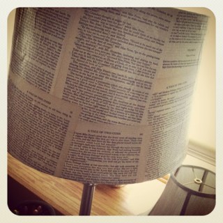 I wasn’t lying. It was 10:30 at night and I sat on my couch with a foam brush, an old book, and a lampshade. Suddenly, I had visions of the future. I’m going to be the spinster who decoupages everything. Lampshades, furniture, picture frames, boxes, cats. You name it, I’ll decoupage it. I’ll decoupage the shit out of it. You think, oh, you can’t decoupage this, and I’ll take it as a challenge. You wanna bet? I’ll say. I’ll carry travel sized bottles of mod-podge on my person at all times and take stock in the business that makes those crappy one-time use foam brushes. Decoupage will be my medium of expressing my suppressed spinster feelings.