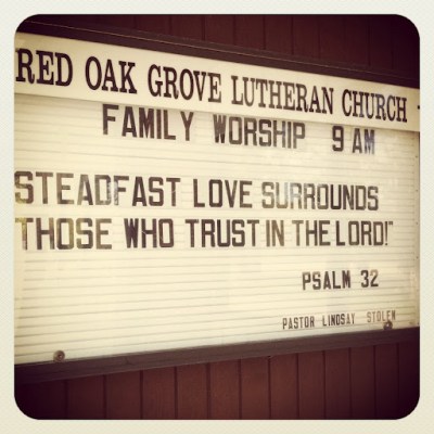 Pastor Lindsay: You know how when you type in all capital letters, it’s like someone is yelling at you? STEADFAST LOVE SURROUNDS THOSE WHO TRUST IN THE LORD! I feel like the sign is yelling at us.
