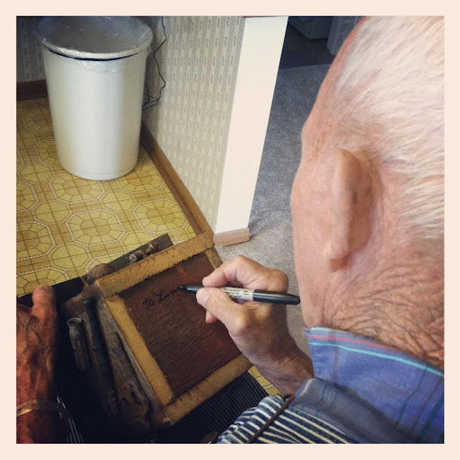 Before I left with the birdhouse, I asked Geeps to write on the bottom of it. His signature “To Linsay. From Gpa Sid.” with the date in his scripted cursive writing. He’s so dang cute. Overalls and all.