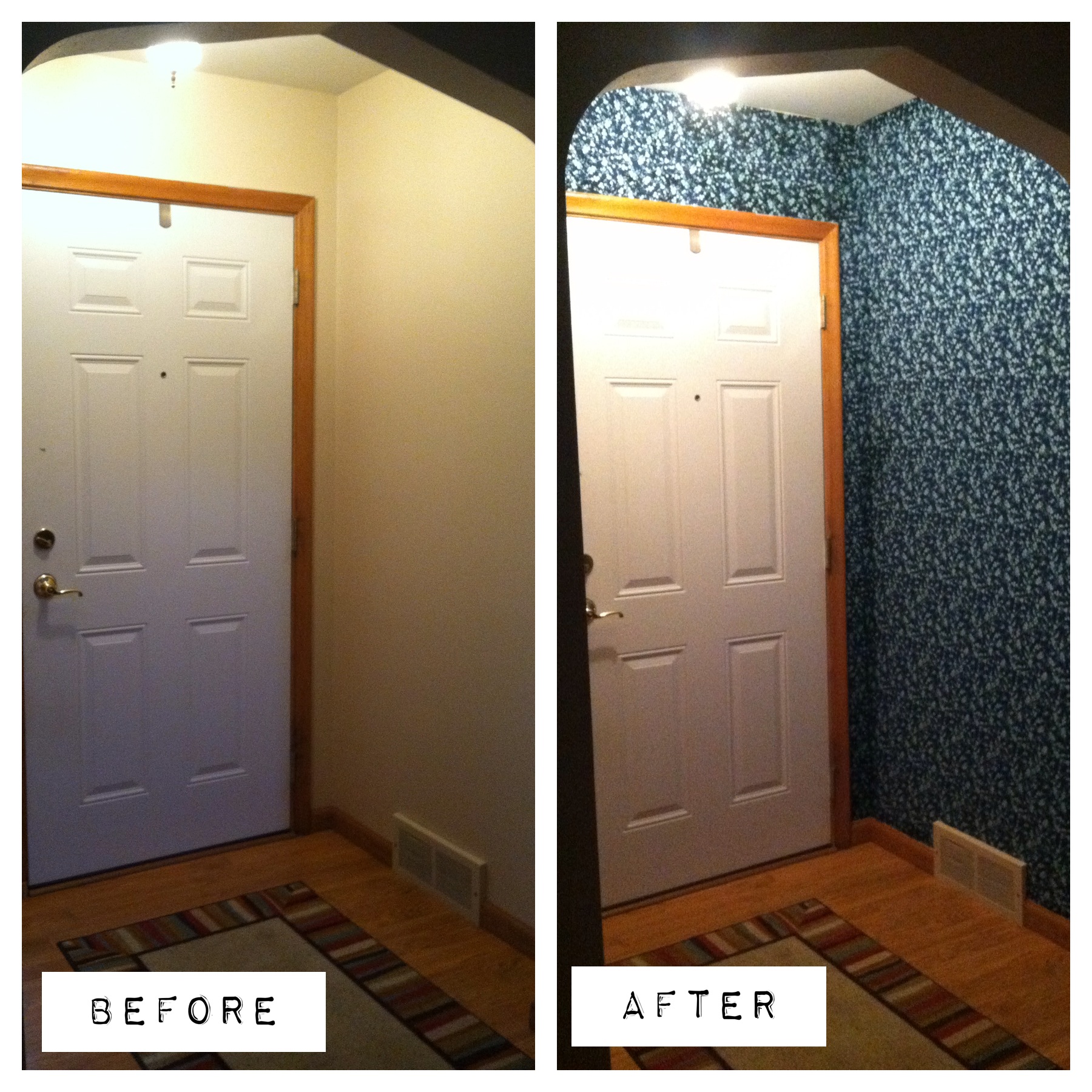 This pin was my inspiration to liquid starch six yards of fabric to my entryway. It took less than three hours and about $20, and I’m in love with the result.