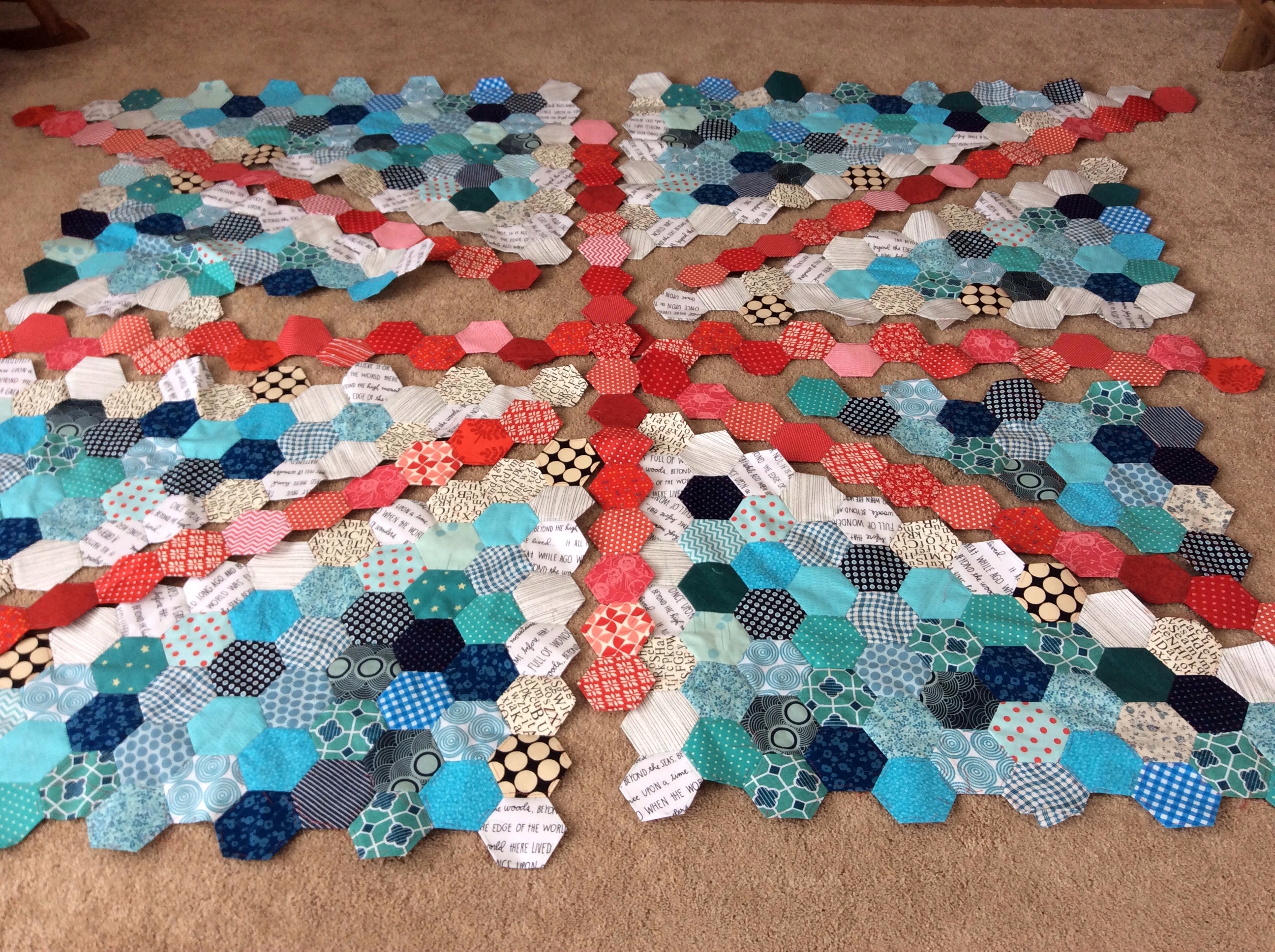 And now I absolutely can’t stop. It’s to the point that I just want to sew, sew, sew until all the hexies are connected. Eek! EPP excitement at this pastor’s parsonage! Here is a quick layout to show where I’m at, big picture style: