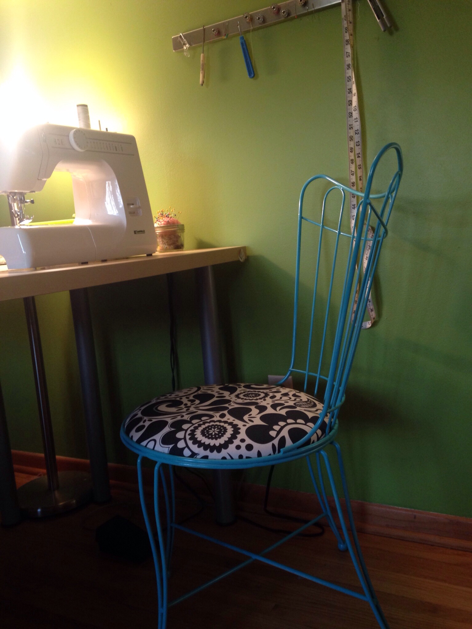 Sadly, the weekend has to end at some point. It’s been highly productive here on Mower Freeborn Road. I have some completed projects and some in-progress projects to show for it. They include but are not limited to: four (finally) recovered dining room chairs; banana blueberry muffins; rhubarb cookies (oh, yes, you read that right); a marked wall grid with the beginning stages of polka dots (which I confess, after much pomp and circumstance and excitement, I’m not sure I like); flower pots planted; coasters for sister, Emma, made (I have now made tile coasters for every member of my immediate family; anyone else need some? Postcards work great.);