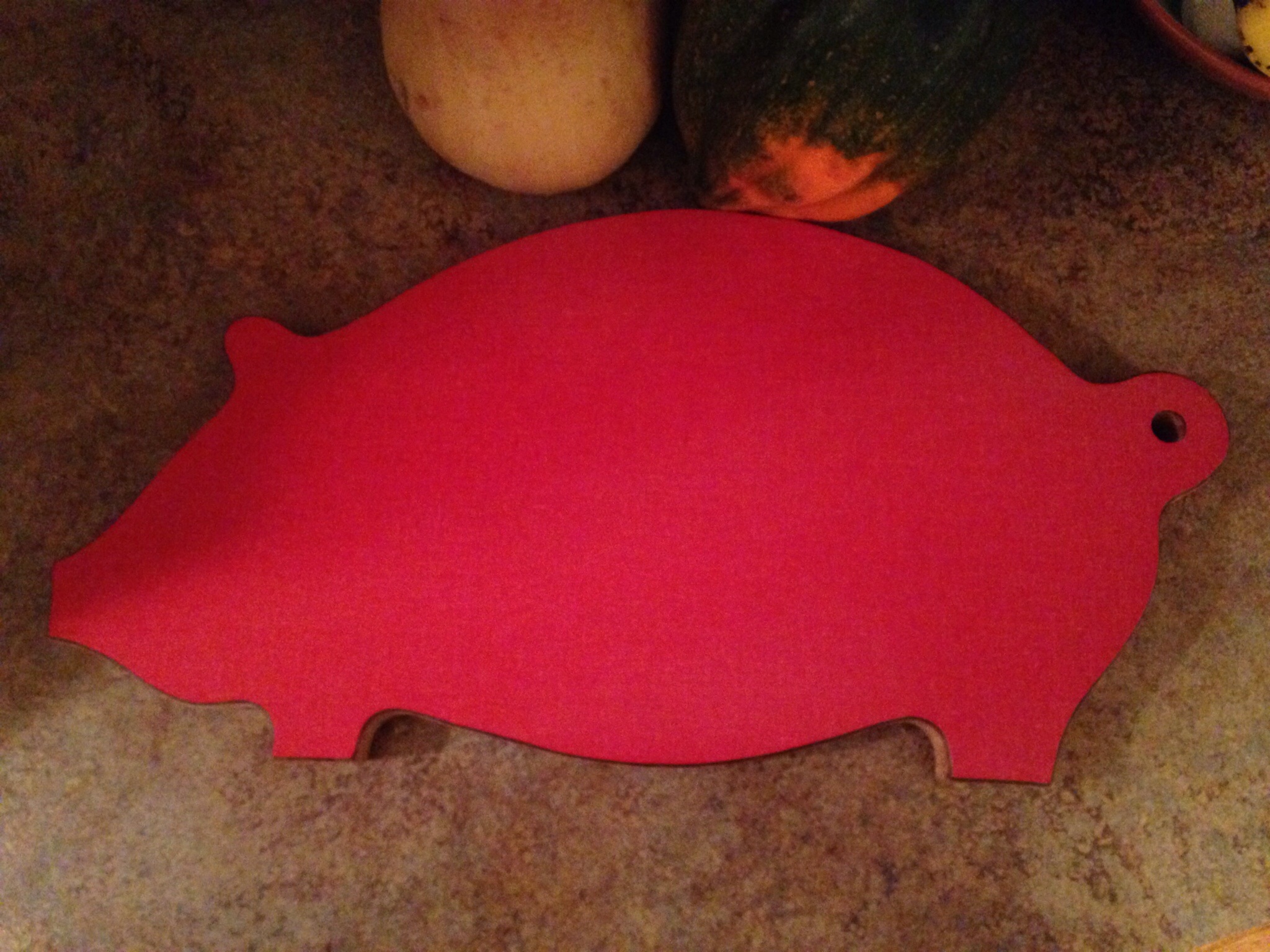 Next, I spied and claimed quickly as mine this bright red pig cutting board/trivet. It definitely belongs in my kitchen.