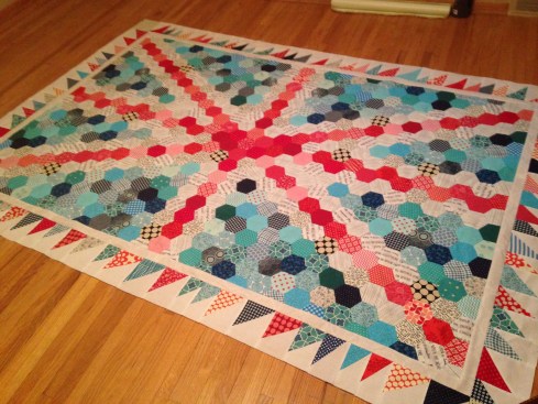 It’s a pretty consistent pattern for me. My hexie quilt hung on my stair rail for nearly a year before I picked it up again. I was intimidated by the next step. But now, all I can think about is finishing it. Energy for the Union Jack abounds where, for the last year, it was nonexistent.