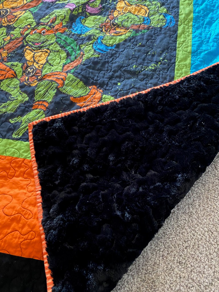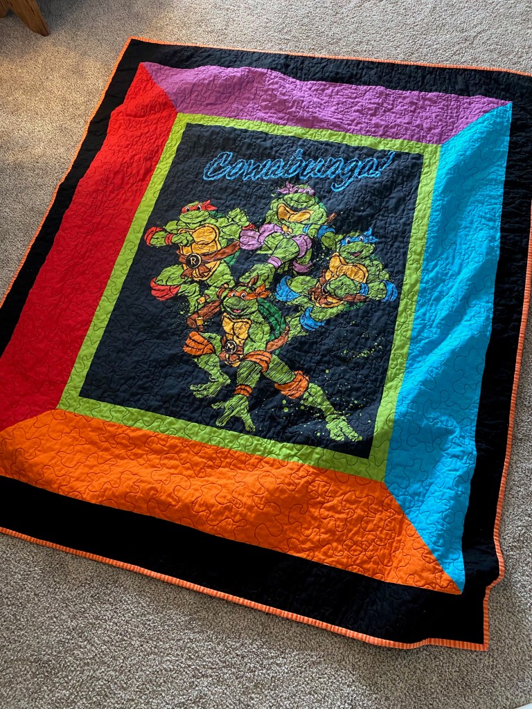 Which was a good thing because quilt panel number two was purchased for him. Dave has a love for all things 80s and nostalgic including the Teenage Mutant Ninja Turtles of his childhood. He instructed me on how to grow the panel into throw-quilt size; the actual panel is as big as the green border. The color choices are his (and certainly *cough* not the route I would have went but it’s his quilt). His is backed in a black minky and equally as cuddly as my Christmas throw.