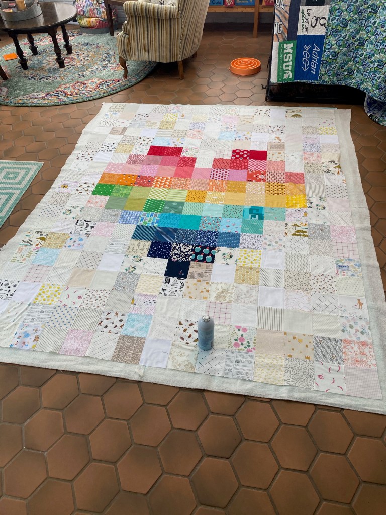 I finished a heart quilt back in February. It’s backed in minky and is a cuddly couch quilt. It was a kit I bought from Maker Valley in an after-Thanksgiving sale. It was super easy to assemble and, as always, I love the bright colors. Here it is being basted on the sunroom floor –
