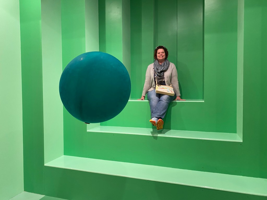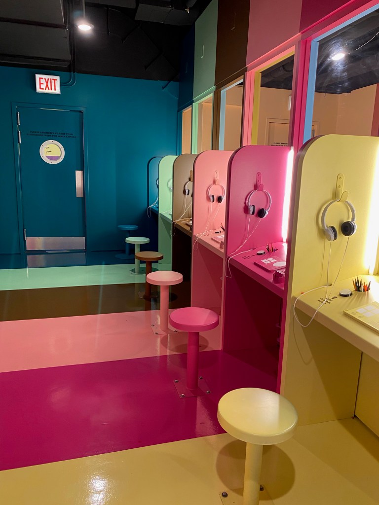 We took the 11:30 train on Saturday, grabbed some lunch in the food hall at Willis tower, and then headed downstairs to The Color Factory. (The first of two factories we’d visit this day.) What colorful fun. Lots of photo opps, laughs and treats. A conveyor belt of macarons to begin. A series of different rooms/experiences that link color to taste, sound, and compliments.