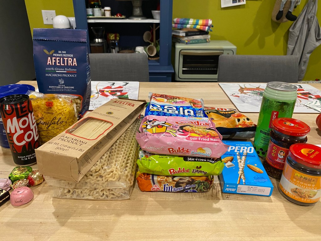 Today (Sunday) was an international day of sorts. We started at Eataly which is a coffee bar, Italian market, bakery, deli, restaurants, etc. etc. (The croissants were so very tempting.) We came home with pasta straight from Italy, chocolates, and coffee. We found that HMart, an Asian grocery, was just a few blocks past Union Station and thus we decided to take a gander and purchase a few things, both known and unknown. (Photo below: Italy on the left, Asia on the right.)