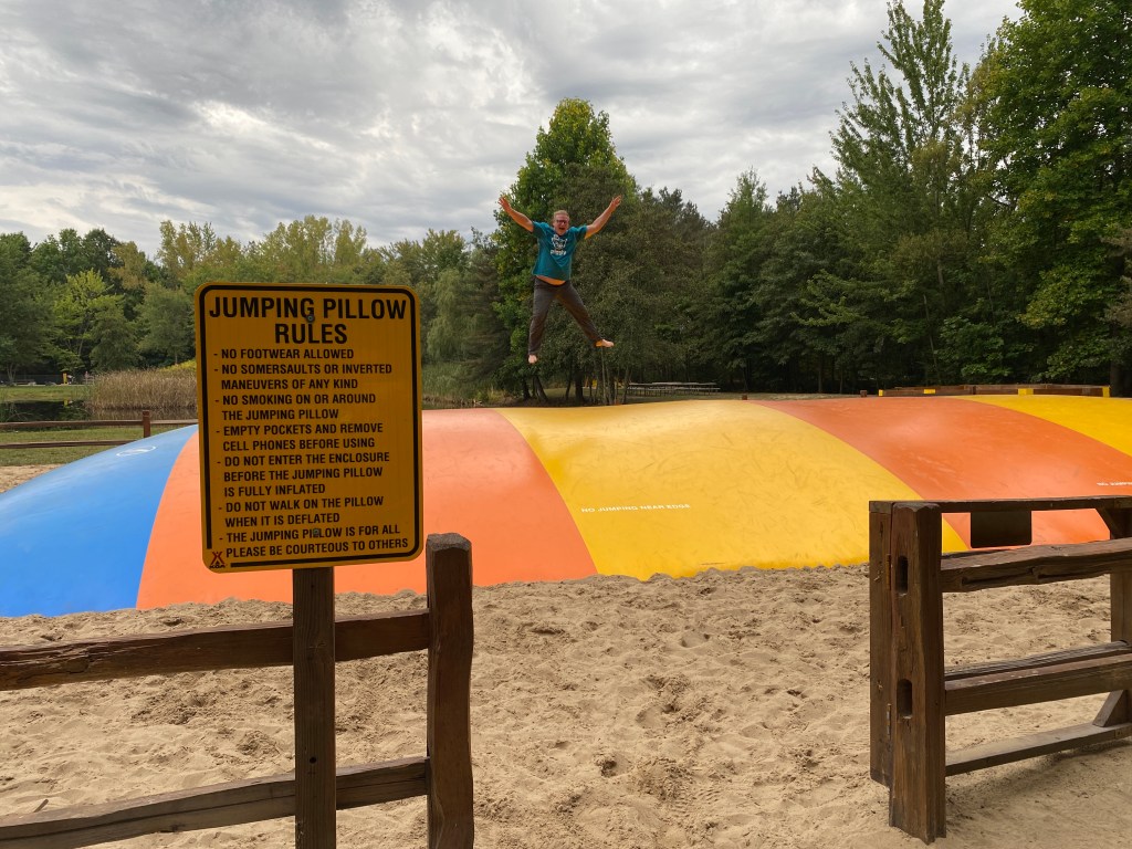 After a good night of sleep in our non-fancy cabin at a super-fancy campground, we made our instant iced coffee (with the most delightful milk jug in the all the land) and walked to the camp store where we ordered breakfast sandwiches. Dave took a couple jumps on the jumping pillow before it started to rain and we packed up.