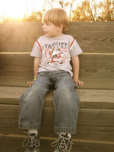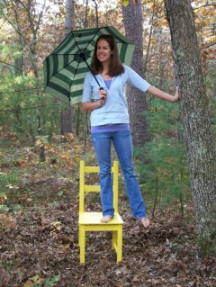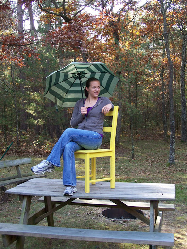 Breakfast. I played barista with Starbucks VIA instant coffee. (Delicious, especially if you add a half a cup of cream like a Poff I know …) The boys came outside once we did to play on the hammock again, afraid to actually go outside by themselves because of the possibility of wild chickens. (I told the story of how one morning we woke up to a flock – flock? – of wild turkeys in the cabin yard.) Then, in true cabin tradition, it was picture time, timer and other. I had brought a wooden chair with me to the cabin to spray paint while there – I live in an apartment in the city – where would I spray paint here? I painted it bright yellow and it begged for further play. Add an umbrella and we had fun. We were off and on our separate ways by noon. Another successful cabin trip.